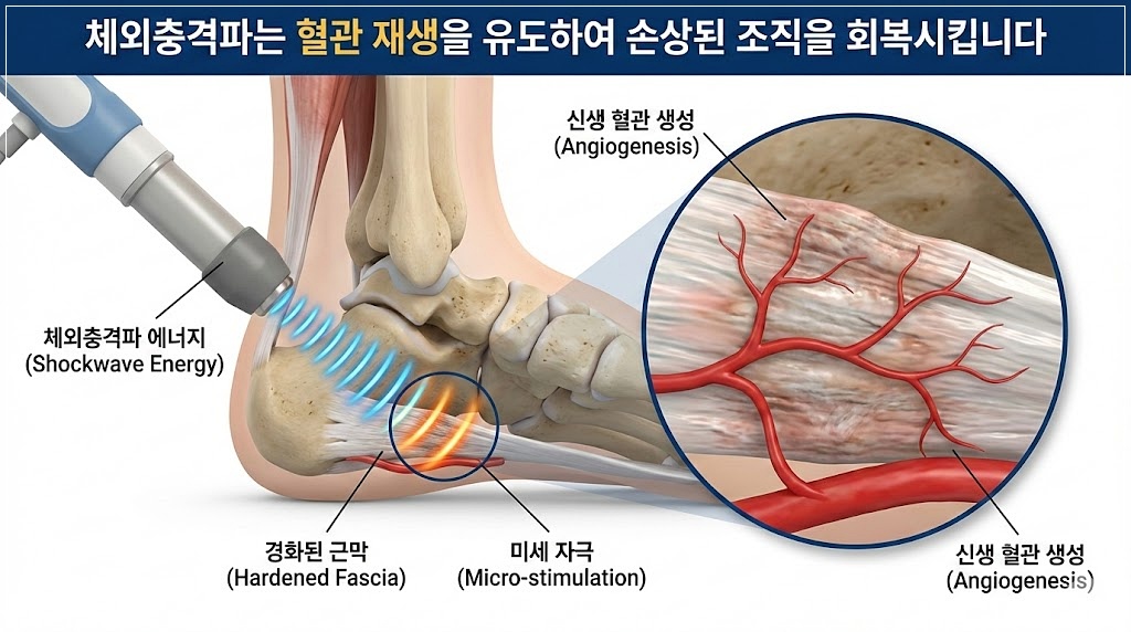 한국보건의료연구원(NECA)[링크]의 연구 보고서에 따르면, 체외충격파는 만성 조직에 미세 순환을 촉진하고 신생 혈관 형성을 유도하여 손상된 근막의 재생을 돕습니다.