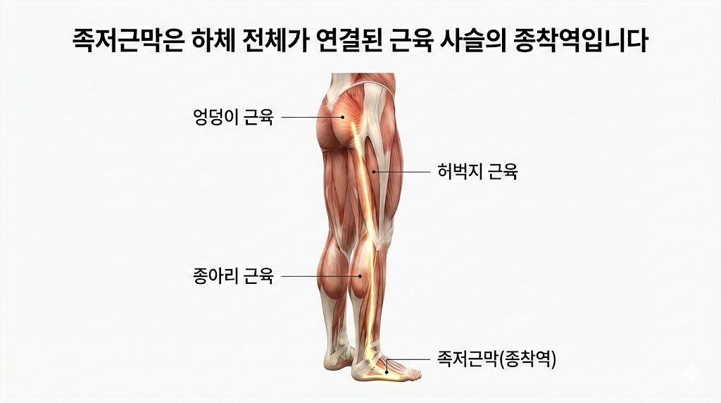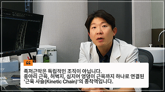 그 이유는 바로 족저근막이 독립된 조직이 아니라 종아리, 허벅지, 심지어 엉덩이 근육까지 하나로 촘촘하게 연결된 근육 사슬(Kinetic Chain)의 종착역이기 때문이에요.