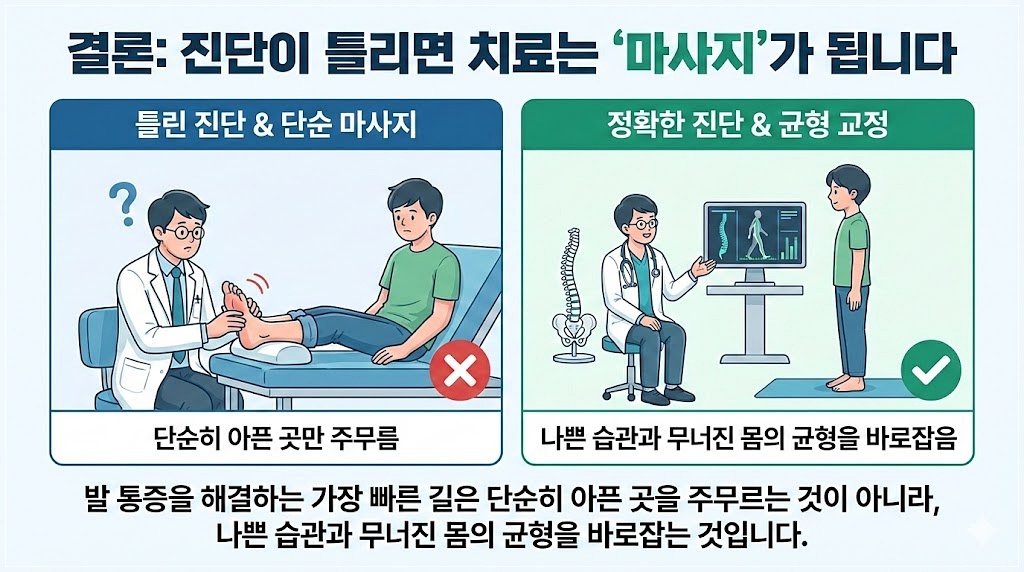 - 아침 첫 발을 딛을 때의 찌릿함은 단순 염증이 아닌 발의 균형이 무너졌다는 신호이므로 근본 원인을 찾아야 합니다.