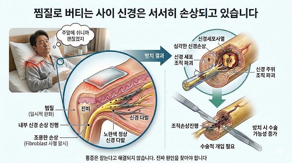하며 찜질로 버티는 사이, 신경 손상은 조용히 진행되어 자칫 수술로 이어질 수도 있습니다.