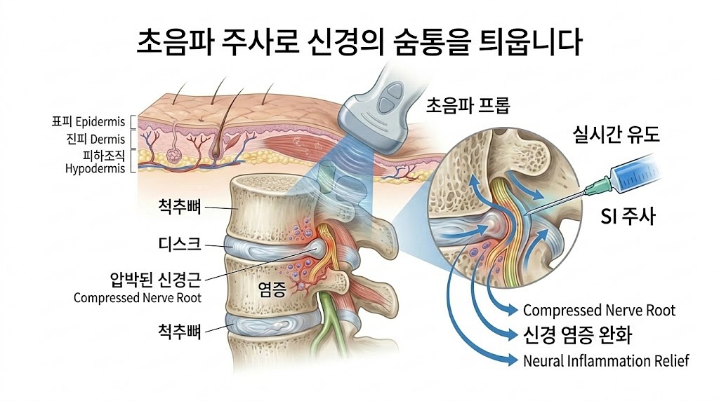 진단 결과 신경 압박이 확인되었다면, 저는 칼을 대는 수술 대신 초음파 유도하(SI) 주사치료를 권해드리고 있어요.
